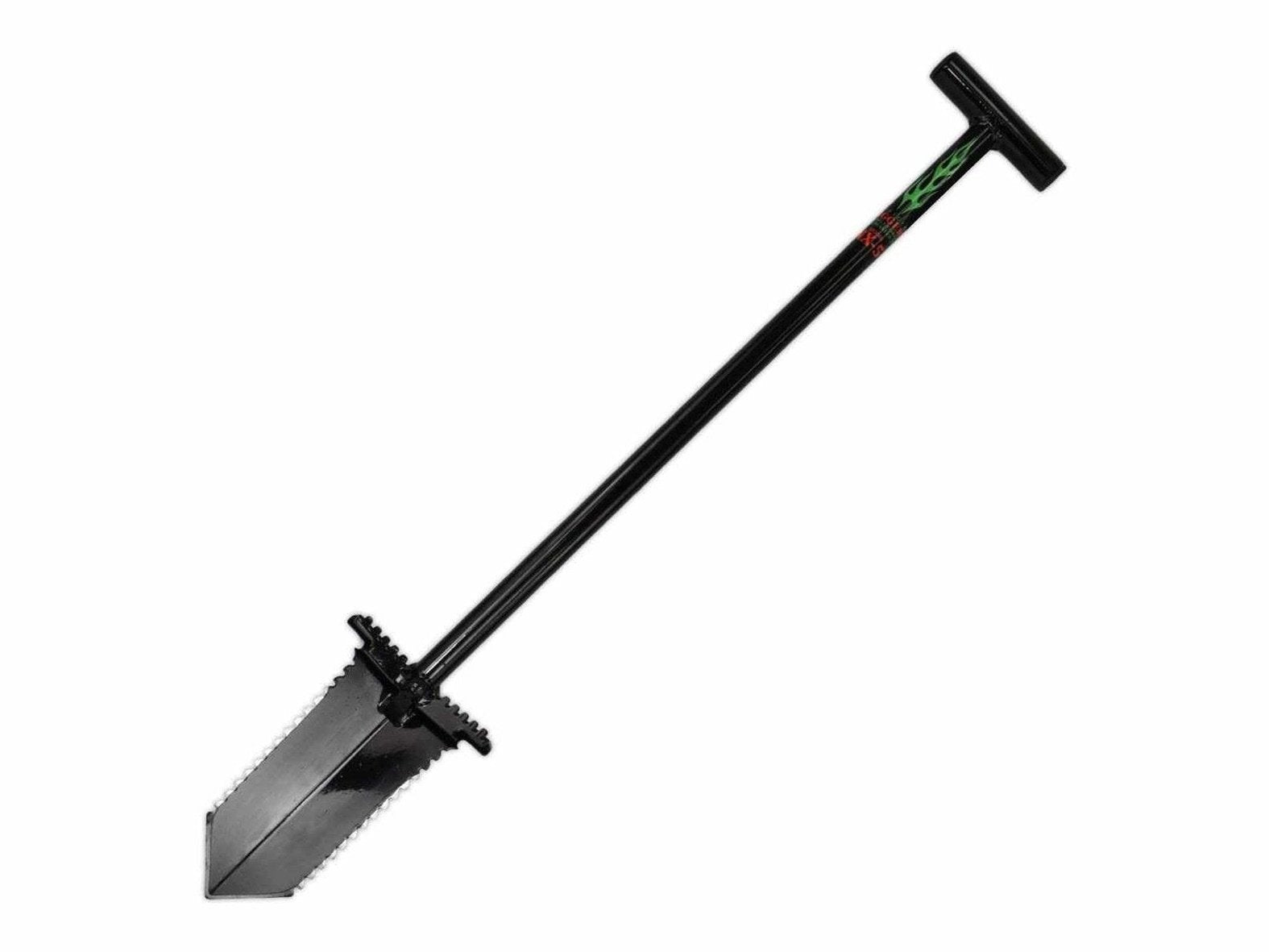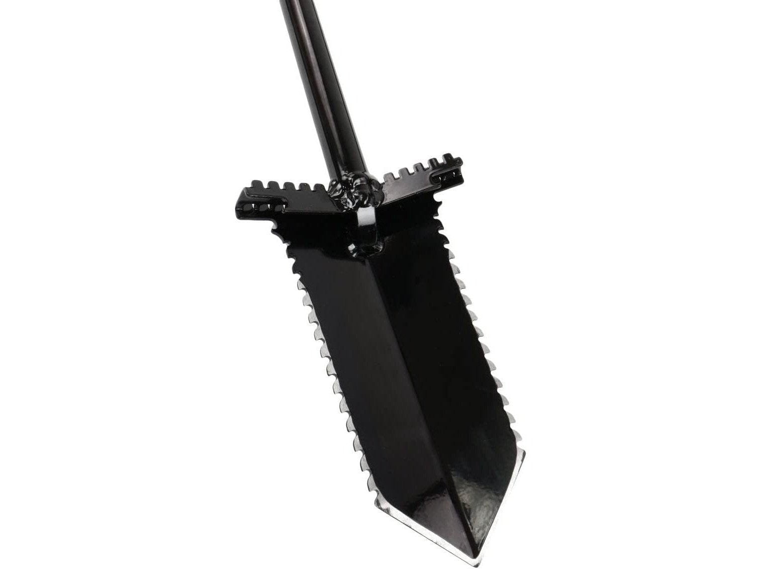 This shovel is made from tempered steel and heat treated for durability. The 33" shovel is powder coated black and the 9" shovel blade has teeth on each side to cut roots. The handle is made to fit a standard 5.5" shovel holster. Also includes a built-in, double-sided bottle opener! Made in the USA.